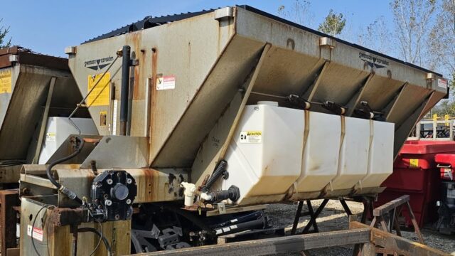 Swenson Stainless Steel 10′ Salt Spreader, 5 CU YD STE has multiple 5 yrd Swenson Stainless V-Hopper Salt Spreaders available. 10ft long x 50” overall height x 84” wide at top 5 cu. yrd. Swenson Stainless Hydraulic V-Hopper Salt Spreader With spinner assembly, top screensTwo pre-wet tanks As is condition (need to be greased, oiled & maintenance done) We can load onto your truck… Read More